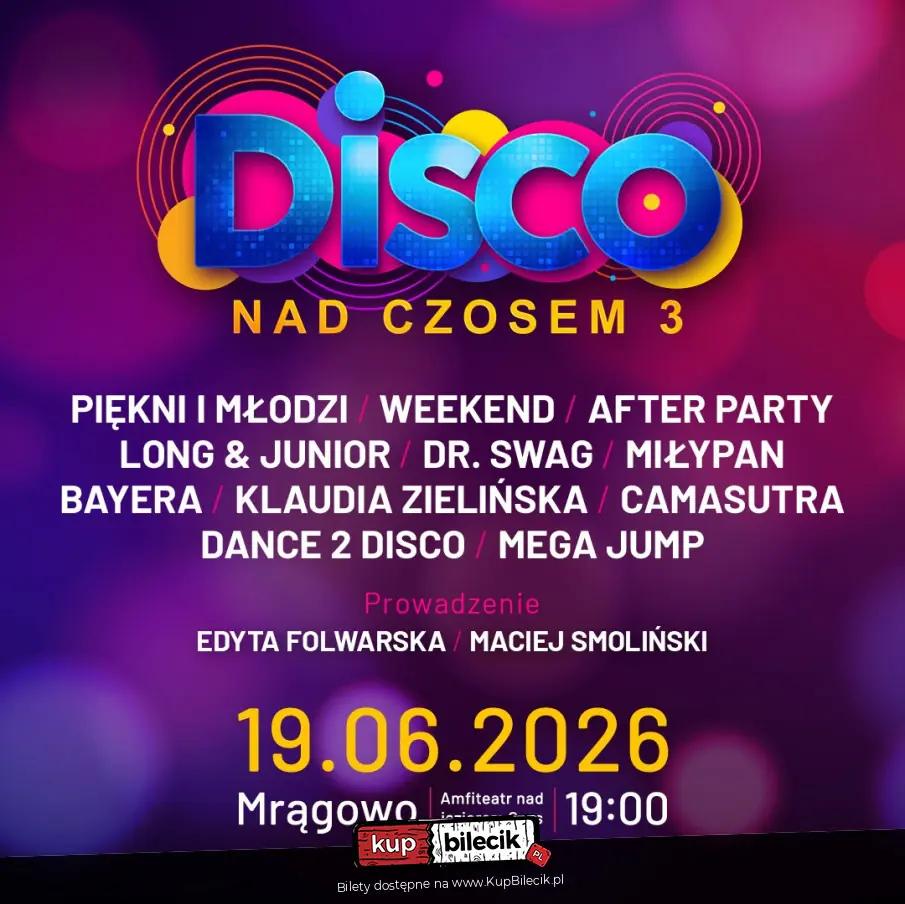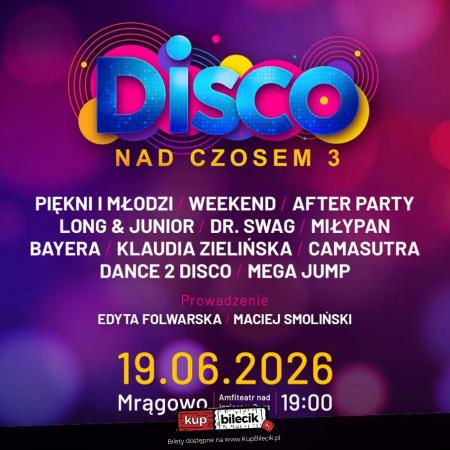 Na scenie słynnego mrągowskiego amfiteatru zobaczycie takich artystów jak: Piękni i Młodzi, Weekend, After Party, Long & Junior, Dr. Swag, MiłyPan, Klaudia Zielińska, Bayera, Camasutra, Dance 2 Disco, Mega Jump, Maciej Smoliński, Faster, Megi i Kasia Malżycka. Imprezę poprowadzą: Edyta Folwarska i Maciej Smoliński.